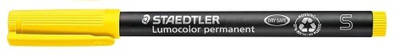 Rotulador permanente STAEDTLER Lumocolor 313 en color amarillo, ideal para marcar y resaltar documentos, carteles o superficies duraderas. Con tecnología DRY SAFE para evitar fugas y secado rápido. Perfecto para uso en oficina, escuela o proyectos creativos. Cuerpo negro con tapa amarilla y marcado de tamaño S. Resistente y de alta calidad.