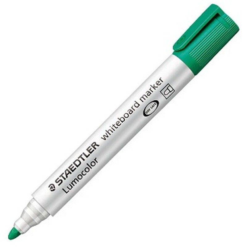 Rotulador para pizarra Lumocolor de Staedtler, color verde, con cuerpo plateado y tapa verde. Ideal para escritura clara y borrado fácil en pizarras blancas. Fabricado en plástico de alta calidad, perfecto para uso en oficinas, aulas o presentaciones. Punta fina para trazos precisos y durabilidad garantizada.
