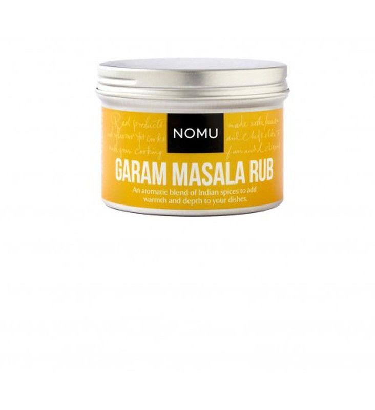 Rub de garam masala NOMU, una mezcla aromática de especias indias en práctico bote metálico de 50 g. Ideal para añadir profundidad y calidez a tus platos. Perfecto para marinar carnes, pescados o verduras. Envase elegante y funcional para conservar la frescura de las especias.