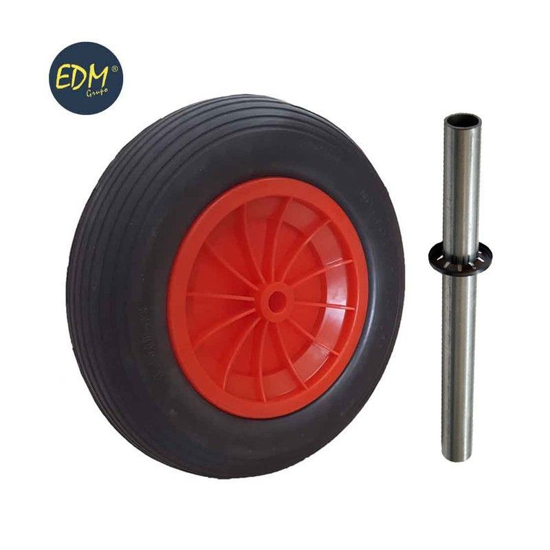 Rueda antipinchazos para carretilla de jardín con llanta roja de plástico y neumático de goma negra, acompañada de eje de acero inoxidable. Ideal para herramientas de jardinería, ofrece durabilidad y resistencia al desgaste. Fácil instalación y uso en carretillas, carros o equipos de mantenimiento del jardín.