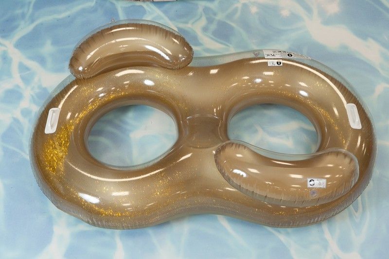 Flotador doble con brillos dorados, ideal para niños y adultos que buscan diversión en la piscina. Fabricado en goma resistente y con diseño ergonómico con asas inflables para mayor seguridad. Perfecto para compartir momentos en el agua con estilo y comodidad.