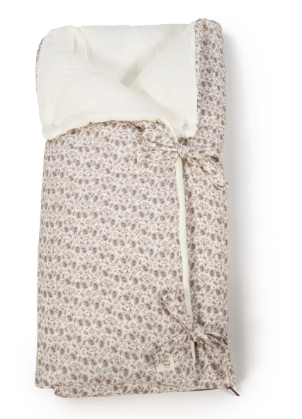 Saco arrullo manta Gala Walking Mum ideal para recién nacidos, con estampado floral en tonos marrones y interior blanco acolchado. Fabricado en algodón y poliéster, ofrece comodidad y seguridad gracias a sus lazos laterales. Perfecto para el transporte y el descanso del bebé, manteniéndolo cálido y protegido.