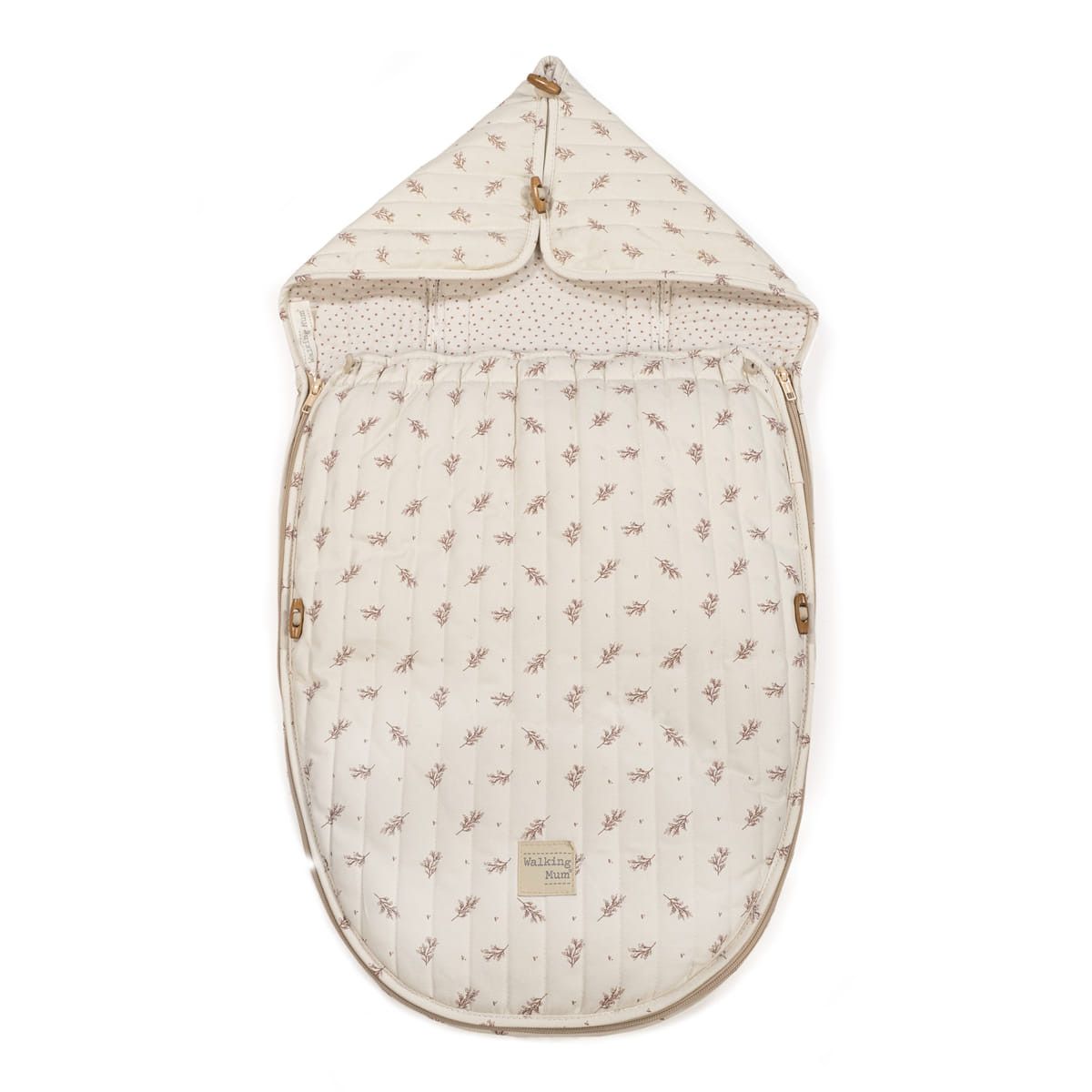 Saco cuco con capucha acolchadaEstampado de pequeñas hojas en tono marrón claro sobre fondo blancoCierre con botones metálicos doradosBordes con ribete en tono beigeEtiqueta de marca 'walking mum' en la parte inferior