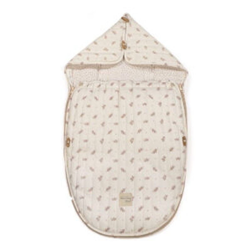 Saco Cuco 2 en 1 entretiempo Mimosa Walking Mum, ideal para bebés de 0 a 12 meses. Confeccionado en algodón y poliéster, ofrece comodidad y protección térmica. Diseño con estampado de hojas marrones sobre fondo blanco, cierre con botones de madera y capucha acolchada. Perfecto para paseos y uso diario, garantiza suavidad y seguridad para tu pequeño
