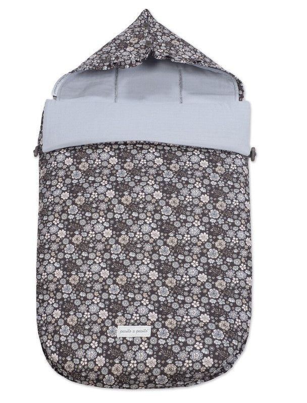 Saco cuco 3 en 1 entretiempo Blossom de Pasito a Pasito, ideal para recién nacidos. Con estampado floral en tonos grises y blancos, forro interior suave y capucha ajustable. Fabricado en algodón y poliéster, ofrece comodidad y protección durante el transporte. Perfecto para usar en cochecito, silla de coche o cuna.