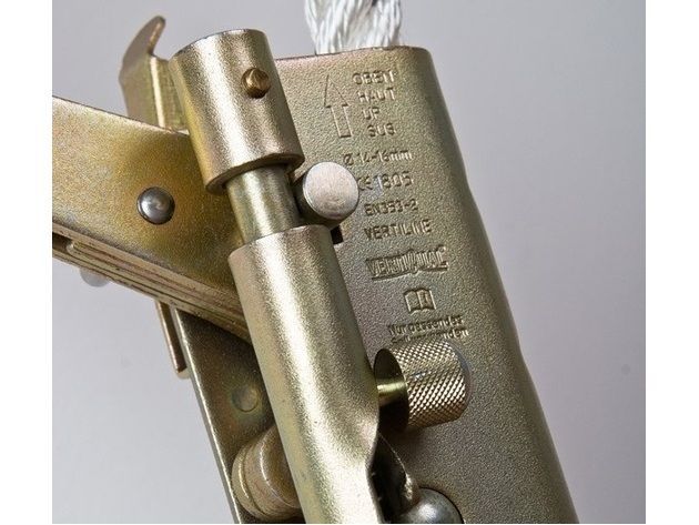 Dispositivo de protección de escalada Safety Jogger VERTILINE UNI GRAB, fabricado en metal de alta resistencia con acabado dorado. Ideal para escaladores que buscan seguridad y durabilidad. Incluye mecanismo de bloqueo con perilla antideslizante y marcas claras para abrir y cerrar. Diseñado para uso profesional en actividades al aire libre.