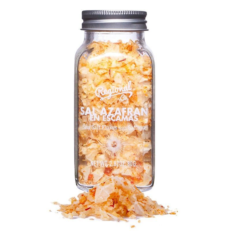 Sal en escamas con azafrán de la marca Regional Co., ideal para realzar el sabor de tus platos con un toque gourmet. Presentada en un frasco de vidrio transparente con tapa metálica, permite ver las escamas de sal con tonos dorados y naranjas por el azafrán. Perfecta para cocinar, salar carnes, pescados o ensaladas con un toque sofisticado. Peso ne