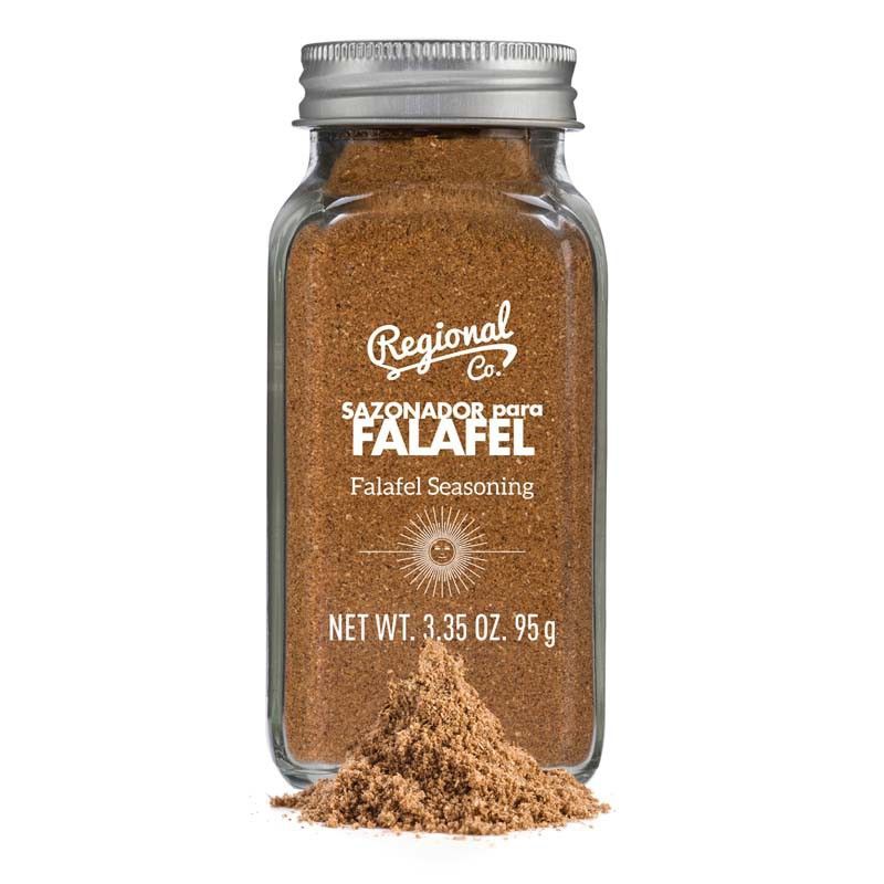 Sazonador para falafel de Regional Co. en práctico frasco de vidrio con tapa metálica. Ideal para realzar el sabor de tus falafels caseros con una mezcla de especias auténticas. Contenido neto: 95 g. Perfecto para cocineros que buscan sabores mediterráneos y orientales en sus platos.