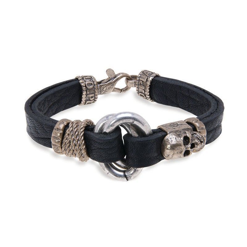 Pulsera SB094X de cuero negro y metal plateado con diseño de calavera, ideal para hombres que buscan un estilo rockero y atrevido. Con cierre de mosquetón y detalles texturizados, combina elegancia y personalidad. Perfecta para usar diariamente o como complemento en looks urbanos y rebeldes.