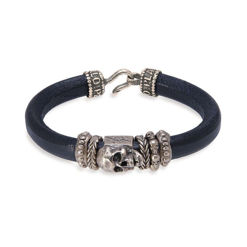 Pulsera SB099X para hombre con diseño de calavera en metal plateado sobre cuerda de cuero azul oscuro. Ideal para amantes del estilo rock y biker. Cierre seguro con gancho metálico y detalles ornamentales que aportan un toque distintivo. Calidad duradera y acabado pulido. Perfecta para usar diariamente o como regalo para hombres con estilo atrevido