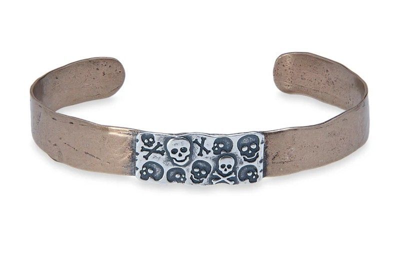 Pulsera unisex SB121X de la colección Tritón, fabricada en bronce y plata de ley 925. Diseño atrevido con calaveras y cruces de huesos, ideal para quienes buscan joyería con carácter y personalidad. Acabado mate y estilo robusto, perfecta para looks urbanos y alternativos.