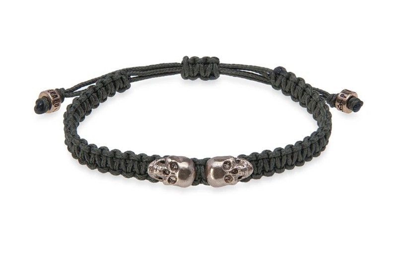 Pulsera unisex SB122V de la colección Draxiel, con diseño trenzado en nylon verde y detalles de calaveras en bronce. Cierre autoajustable para un ajuste cómodo. Ideal para amantes del estilo urbano y rockero. Materiales resistentes y acabado de calidad.