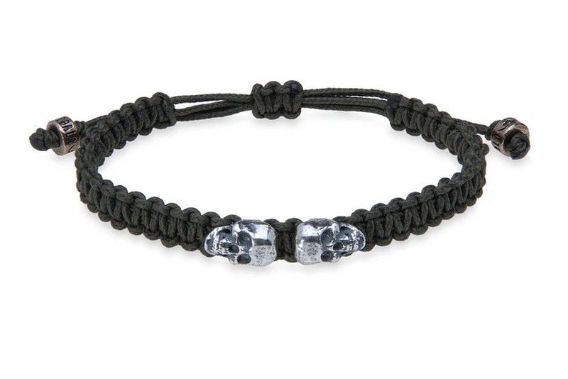Pulsera unisex SB123V de nylon negro trenzado con dos calaveras de plata 925, diseño Elunara. Ajustable mediante nudos, ideal para amantes del estilo punk, gótico o alternativo. Calidad premium, resistente y cómoda para uso diario. Perfecta como regalo o complemento de look.