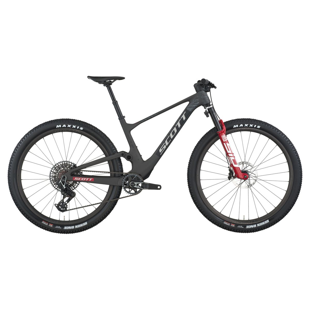 Bicicleta de montaña con suspensión delanteraCuadro de carbono con detalles en rojoRuedas con neumáticos maxxisTransmisión de 12 velocidadesFrenos de disco hidráulicosLogotipo scott en el cuadro