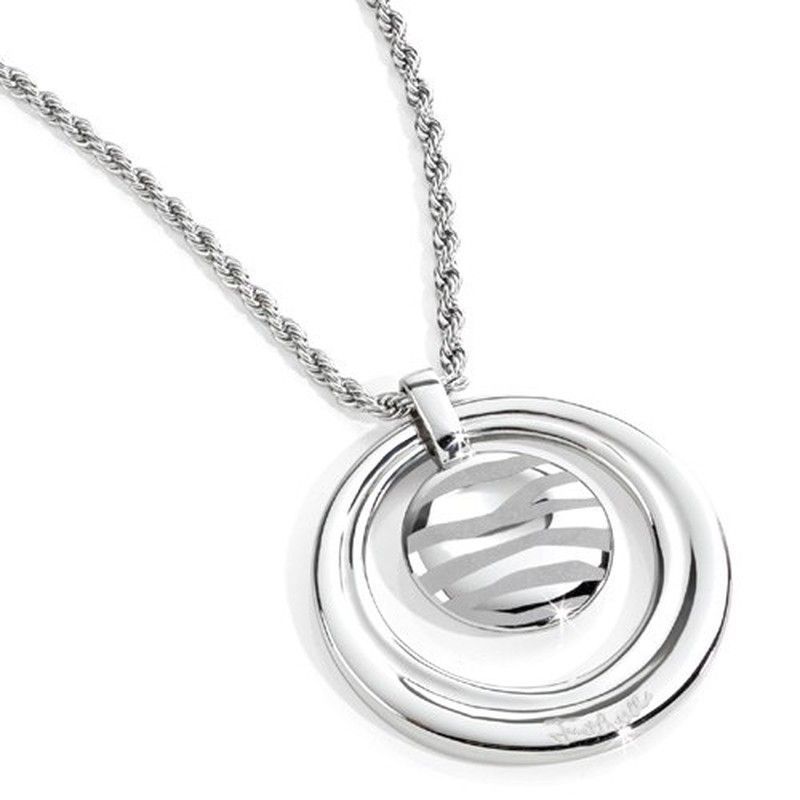 Colgante JUST Cavalli colección Oasi, diseño elegante con anillos concéntricos en acero inoxidable plateado. Ideal para mujeres que buscan joyería sofisticada y moderna. Cadena fina y acabado pulido para un look versátil y atemporal. Perfecto como regalo o complemento diario.