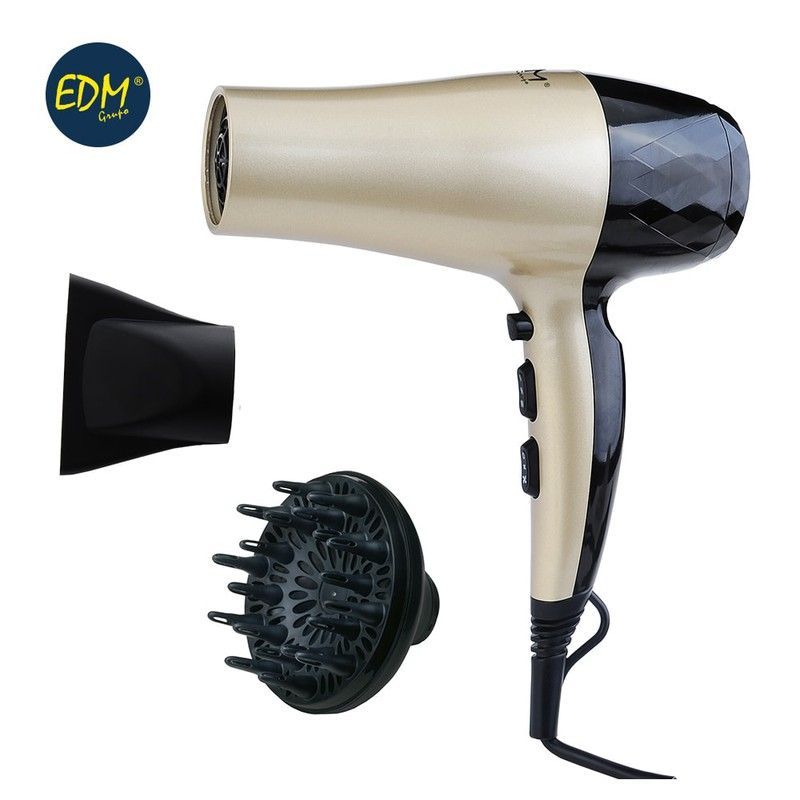 Secador de cabello EDM de 1800-2200W con diseño elegante en dorado y negro. Ideal para un secado rápido y profesional. Incluye difusor y boquilla concentradora para mayor versatilidad. Fabricado con plástico y metal de alta calidad, perfecto para uso diario en casa o salones.