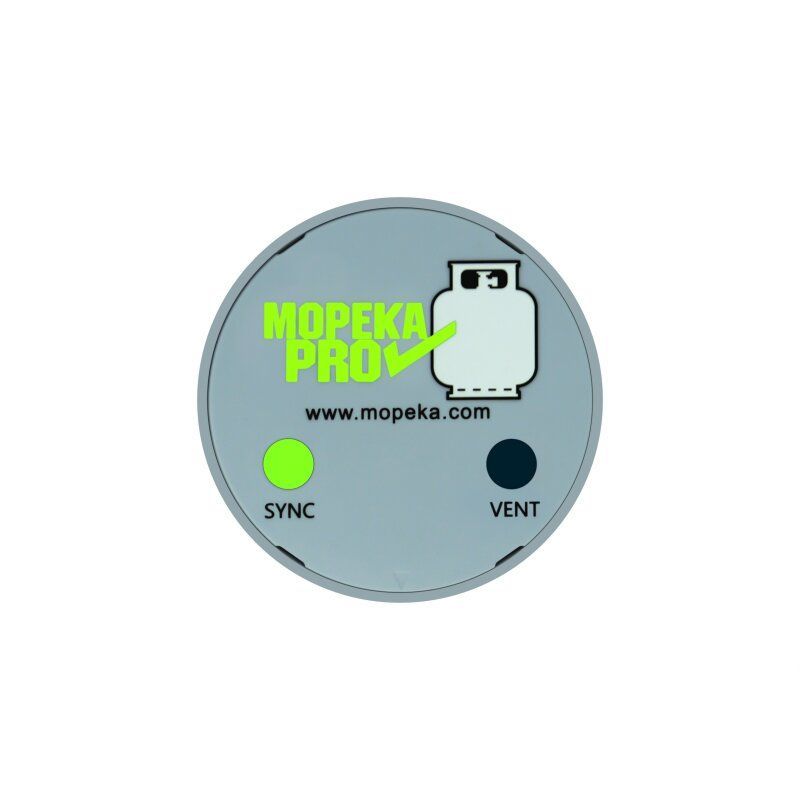 Sensor indicador de nivel de gas Mopeka Pro para bombona con conexión Bluetooth, ideal para vehículos motorizados. Diseño circular compacto con indicadores LED SYNC y VENT, fácil instalación con imán. Fabricado en plástico y metal resistente, ofrece precisión y comodidad en tiempo real. Perfecto para monitorear el gas en caravanas, motocicletas o v