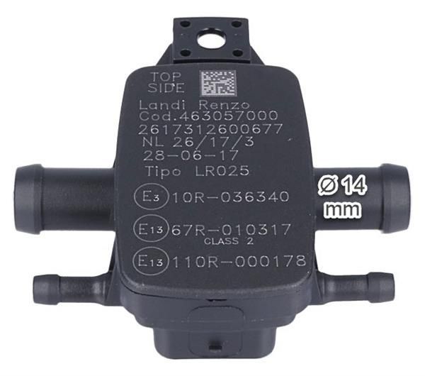 Sensor MAP Landi Renzo LR025 de 14 mm, diseñado para vehículos con sistema de gas. Fabricado en plástico y metal, ofrece precisión en la medición de presión del manifold para un rendimiento óptimo del motor. Ideal para instalaciones de gas natural o GLP en vehículos. Incluye certificaciones E3 y E13, garantizando calidad y compatibilidad con normat