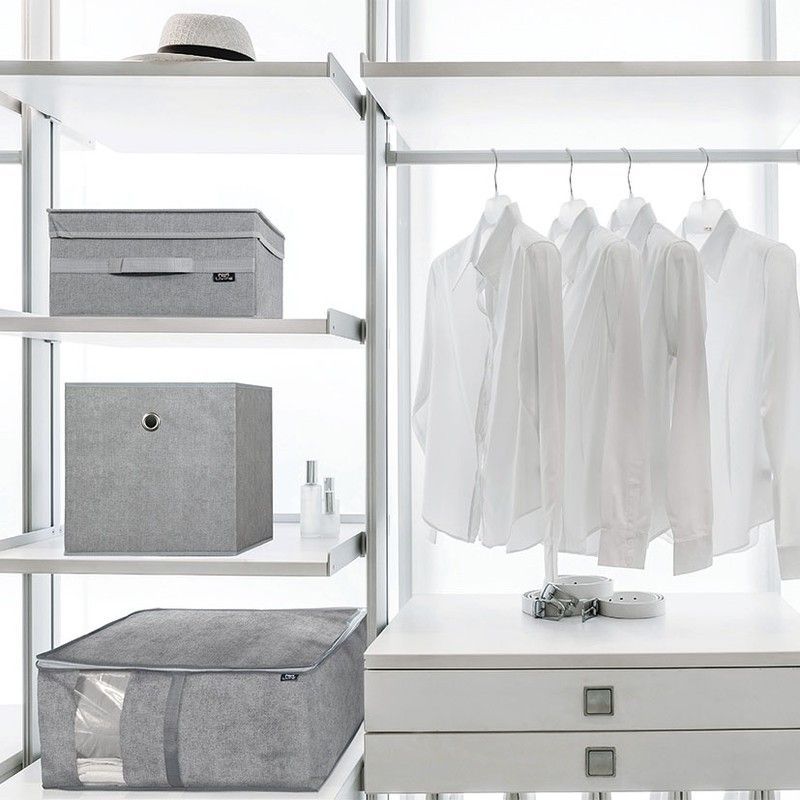 Caja guarda ropa de la serie Stone, fabricada en lona gris resistente y con cierre de cremallera lateral. Ideal para organizar y guardar prendas en armarios o estanterías. Su diseño minimalista y funcional se adapta a cualquier espacio del hogar, manteniendo la ropa ordenada y protegida. Perfecta para uso diario en dormitorios o vestidores.