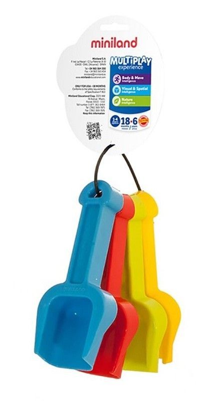 Juego de 4 palas para bebé en colores azul, rojo y amarillo, fabricadas en plástico seguro y resistente. Diseño ergonómico ideal para pequeñas manos, perfectas para juegos en la arena o en el baño. Incluye etiqueta con información y recomendado para niños de 18 a 60 meses. Ideal para desarrollar la motricidad y el juego imaginativo.