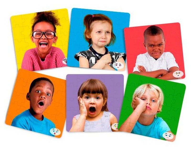 Set de 4 puzzles educativos sobre emociones para niños, con tarjetas coloridas que muestran expresiones faciales de niños reales. Ideal para enseñar a reconocer y nombrar emociones desde edades tempranas. Fomenta el desarrollo emocional y social en niños pequeños. Diseño atractivo y fácil de usar en casa o en el aula.
