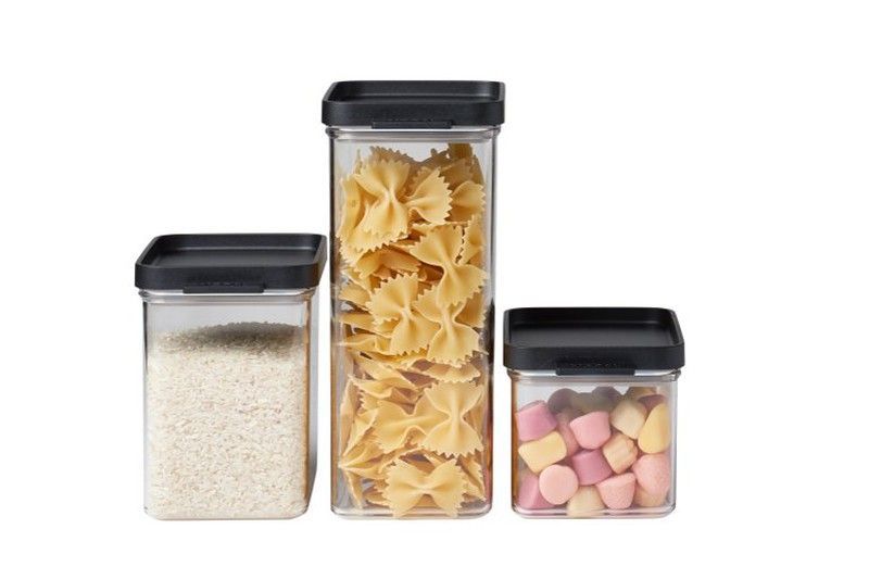 Set de 3 botes de almacenamiento para cocina Omnia, con tapas negras y cuerpo transparente. Ideal para organizar arroz, pasta, azúcar o snacks. Diseño moderno y hermético para mantener los alimentos frescos. Perfecto para cualquier cocina.