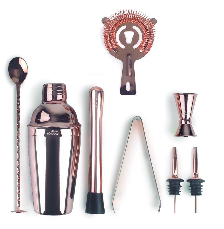 Set de coctelería Lacor en acero inoxidable con acabado cobre, ideal para preparar cócteles con estilo profesional. Incluye coctelera, barra de mezcla, cuchara, colador, pinzas, jigger y pinchos. Diseño elegante y funcional para amantes de la mixología en casa o en bares. Calidad duradera y fácil de limpiar.