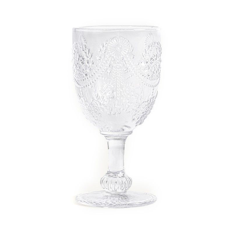 Set de 3 copas de cristal transparente, ideales para servir vino, agua o cócteles con estilo. Diseño clásico con detalles tallados en relieve, incluyendo motivos florales y geométricos. Fabricadas en cristal de alta calidad, con pie decorado y base texturizada. Perfectas para ocasiones especiales o uso diario en tu mesa. Dimensiones: Ø 8 x 17 cm. E