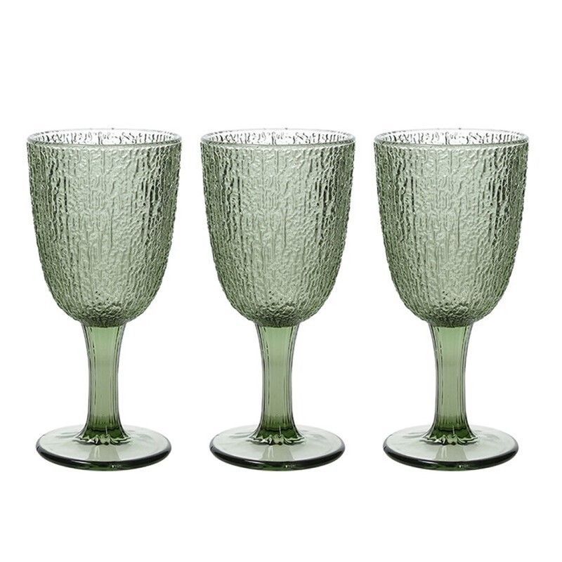 Set de 3 copas de vino de cristal en verde, con elegante textura ondulada que aporta un toque sofisticado a tu mesa. Ideales para servir vino o cócteles, estas copas de cristal de alta calidad combinan estilo y funcionalidad. Perfectas para ocasiones especiales o uso diario en tu hogar.