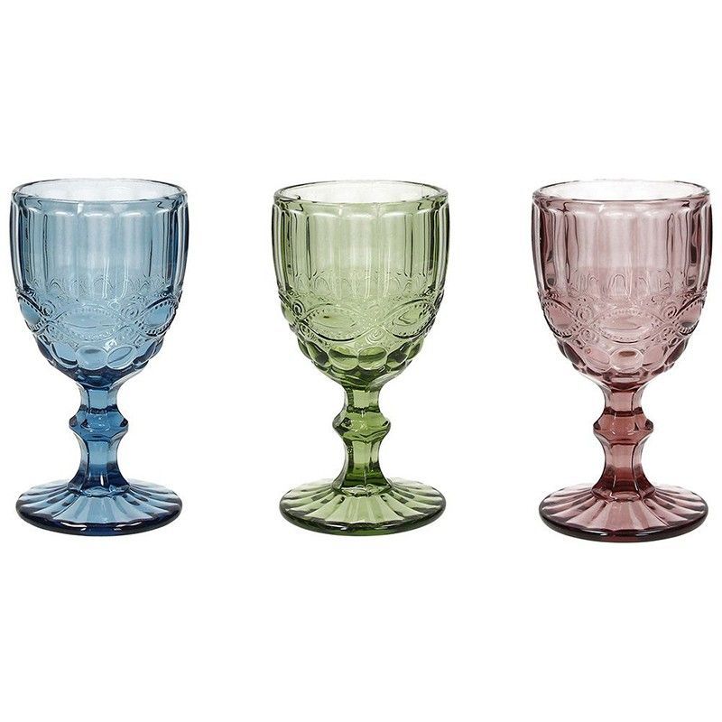Set de 3 copas de vino de vidrio en tonos azul, verde y morado, con diseño tallado y base decorativa. Ideales para servir vino o cócteles con estilo retro. Fabricadas en vidrio de calidad, estas copas aportan un toque elegante a cualquier mesa. Perfectas para ocasiones especiales o uso diario en casa.