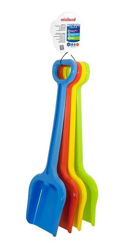 Set de 4 palas de plástico para niños, ideales para juegos en la arena o en el jardín. Con colores vibrantes (azul, rojo, amarillo y verde) y mango largo, fáciles de manejar para pequeños. Perfectas para actividades al aire libre y juegos de construcción. Incluye etiqueta de marca Miniland y recomendado para niños a partir de 15 meses.