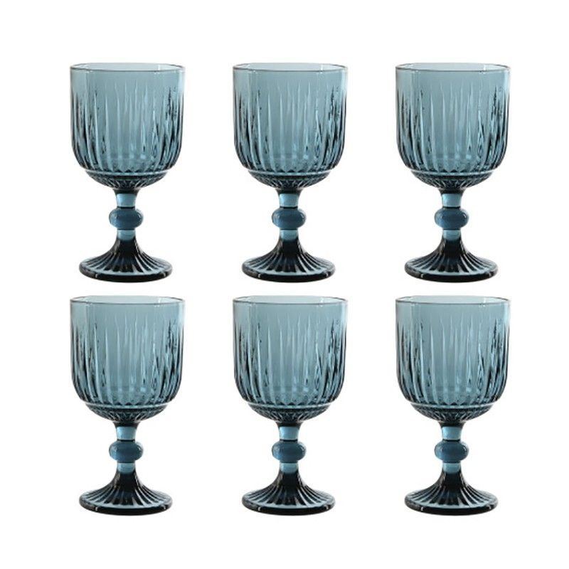 Set de 6 copas de agua de cristal en tono azul, con elegante diseño de rayas verticales y base con detalles esféricos. Ideal para servir agua, vino o cócteles en cualquier ocasión. Fabricadas en cristal de alta calidad, estas copas aportan un toque sofisticado a tu mesa. Perfectas para uso diario o eventos especiales.