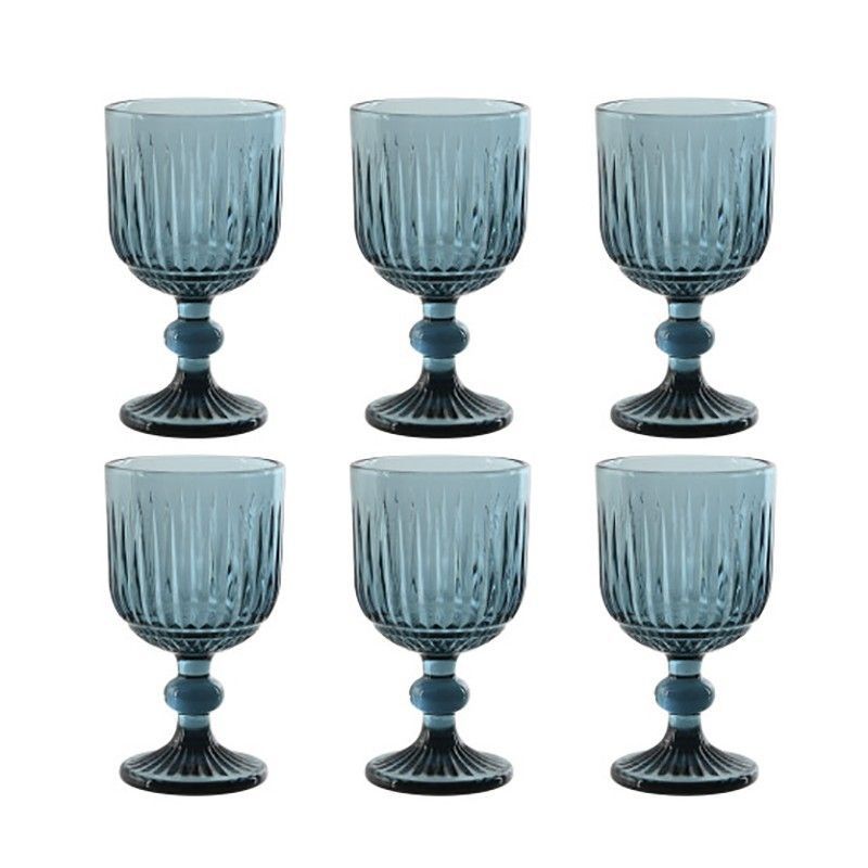 Set de 6 copas de vino de cristal en tono azul, con elegante diseño de rayas verticales y base estriada. Ideal para servir vino o cócteles con estilo. Perfecto para decorar tu mesa en ocasiones especiales o uso diario. Calidad duradera y diseño clásico que combina con cualquier estilo de cocina o comedor.