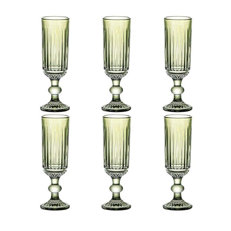 Set de 6 copas flauta de cristal en tono verde, colección Striped. Diseño elegante con rayas verticales y base decorada, ideal para servir cócteles, champán o vinos espumosos. Perfectas para ocasiones especiales o uso diario en tu mesa. Calidad duradera y estilo clásico.