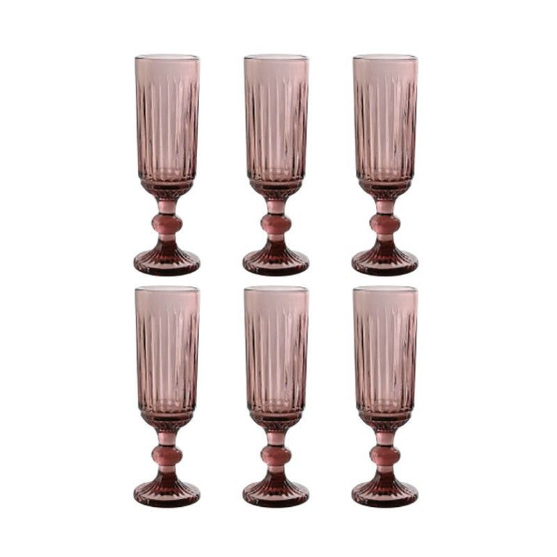 Set de 6 copas flauta de cristal en tono rosa, con elegante diseño de rayas verticales y base decorativa. Ideal para servir cócteles, vino o agua con estilo. Fabricadas en cristal de calidad, perfectas para cualquier ocasión, desde cenas íntimas hasta fiestas sofisticadas. Aportan un toque vintage y sofisticado a tu mesa.