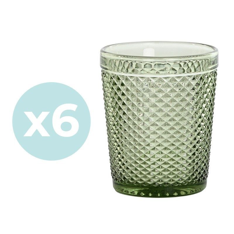 Set de 6 vasos de cristal verde con textura diamante, ideales para agua, cócteles o como decoración en tu mesa. Hechos de cristal de calidad, con acabado elegante y diseño sofisticado. Perfectos para uso diario o ocasiones especiales. Dimensiones: Ø 8 x 10 cm. Aportan un toque moderno y refinado a tu cocina o comedor.