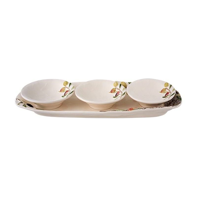 Set de aperitivos de loza en blanco roto con diseño de hoja verde y detalles en rosa, ideal para servir tapas, frutas o postres con estilo. Fabricado en loza de calidad, incluye tres cuencos y una bandeja rectangular con acabado decorativo. Perfecto para uso diario o ocasiones especiales en la mesa.