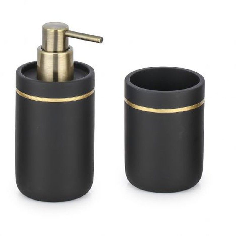 Juego de baño elegante en negro mate con detalles dorados, compuesto por un dosificador y un vaso. Fabricado en cerámica y metal, ideal para baños modernos y sofisticados. Aporta un toque de lujo y funcionalidad a tu espacio. Perfecto para uso diario y como regalo.
