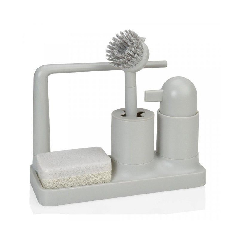Set de lavado en resina gris, ideal para cocina o baño. Incluye soporte con compartimentos para esponja, cepillo de cerdas metálicas y dispensador de jabón. Diseño compacto y funcional para mantener el área de lavado organizada y limpia. Materiales resistentes y duraderos. Perfecto para uso diario en hogares modernos.
