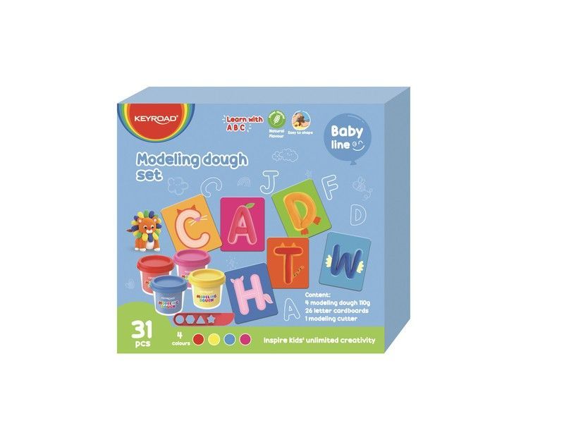 Set de pasta de modelar para niños con 4 colores vibrantes y 26 letras del abecedario para aprender mientras juegan. Incluye 1 moldeador y 31 piezas en total. Ideal para desarrollar la creatividad y habilidades motoras en niños pequeños. Embalaje atractivo con diseño educativo y divertido.