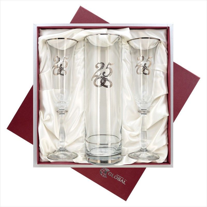 Set conmemorativo GA4251V para bodas de plata, compuesto por un jarrón y dos copas de vidrio con elegante grabado plateado del número '25' y diseño de alianzas. Presentado en caja roja con forro blanco. Ideal para regalar en aniversarios de 25 años, con acabado sofisticado y duradero. Perfecto para decorar o disfrutar en celebraciones especiales.