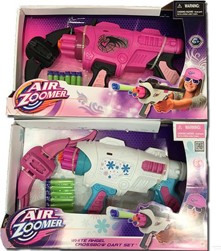 Set de pistola de dardos Air Zoomer para niños, con diseño divertido en rosa y blanco. Incluye pistola de juguete, dardos y gafas de protección. Ideal para juegos al aire libre y entretenimiento familiar. Embalaje con ventana transparente para ver el contenido. Perfecto para niños que disfrutan de juegos activos y seguros.