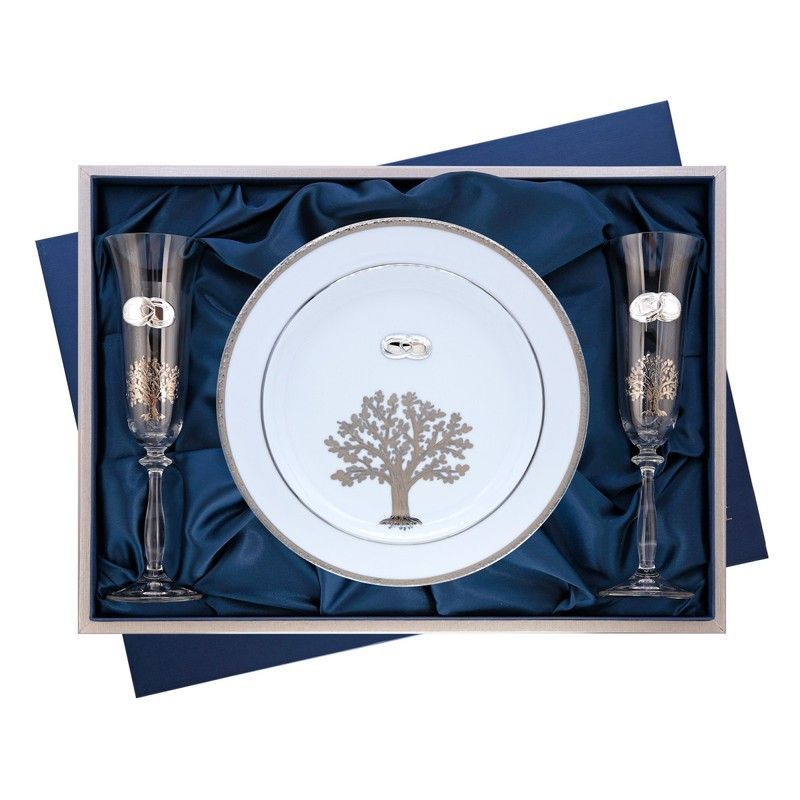 Set conmemorativo GA4309A 'Árbol de la Vida' ideal para bodas o aniversarios. Incluye un plato de cerámica con diseño elegante de árbol de la vida y dos copas de vidrio con detalles grabados y anillos de boda. Presentado en una caja con forro de terciopelo azul marino. Un regalo simbólico y sofisticado para parejas que celebran su amor.