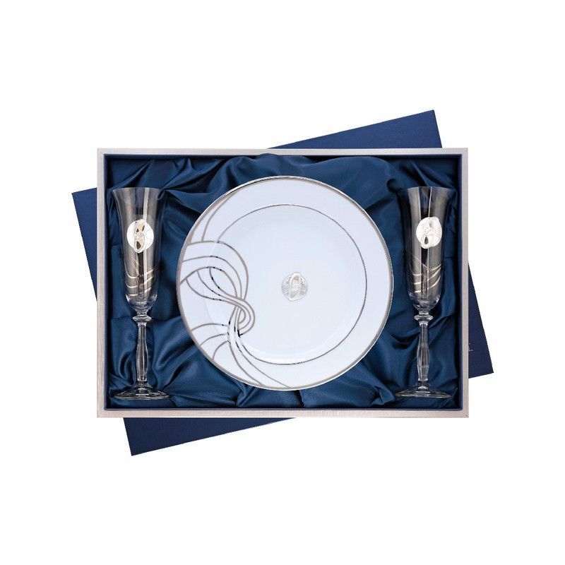 Set conmemorativo GA4312A Alianzas compuesto por un plato de porcelana blanca con elegante diseño plateado y dos copas de vidrio con detalles de alianzas. Ideal para celebraciones especiales como bodas o aniversarios. Presentado en caja rectangular con forro azul, perfecto como regalo sofisticado y duradero.