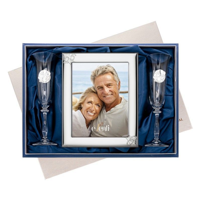 Set elegante para aniversario de 25 años con marco para foto de 18x24 cm y dos copas de cristal con diseño de anillos. Presentado en caja con forro de terciopelo azul. Ideal para regalar a parejas celebrando su cuarto de siglo de amor. Un detalle sofisticado y conmemorativo para recordar momentos especiales.