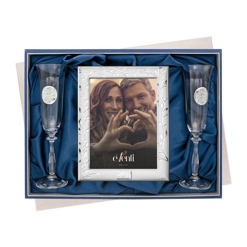 Set de regalo elegante para el 25º aniversario de boda, compuesto por un marco fotográfico con diseño de árbol de la vida y dos copas de cristal, todo presentado en una caja con forro de terciopelo azul. Ideal para parejas que celebran su aniversario de plata. Un detalle sofisticado y conmemorativo para recordar un momento especial.