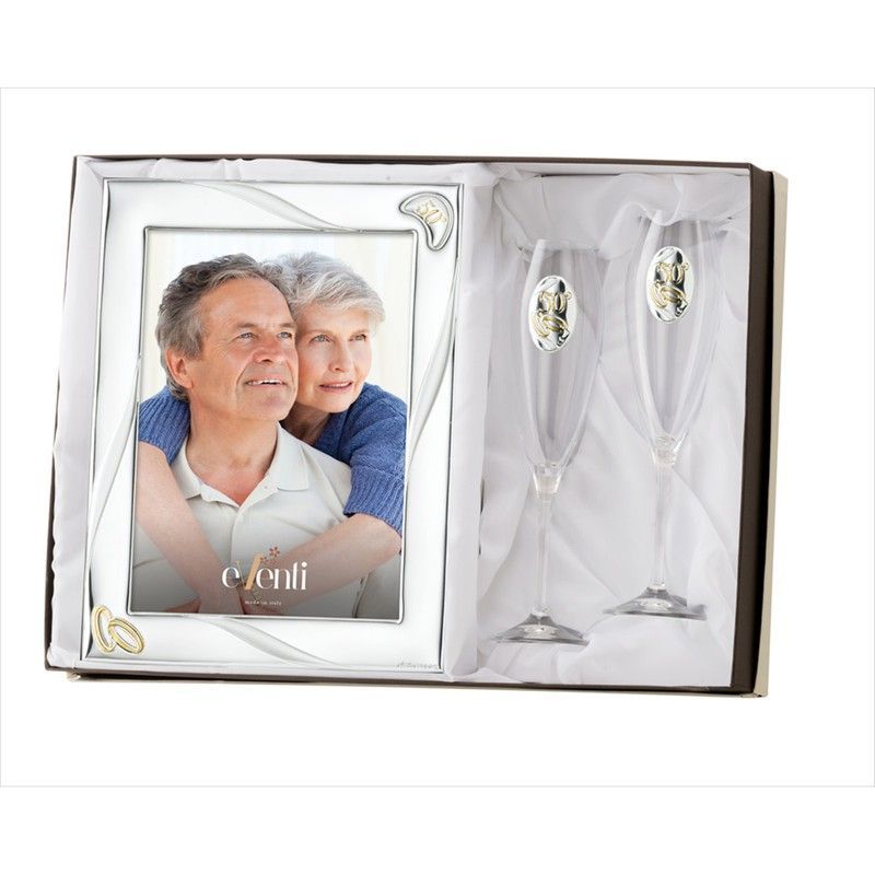 Set conmemorativo de 50 años de matrimonio que incluye un portafotos de 13x18 cm con marco plateado y dos copas de cristal con detalles de anillos. Ideal para regalar a parejas celebrando su aniversario de oro. Presentado en caja elegante con forro blanco. Un detalle sofisticado y emotivo para recordar una vida juntos.