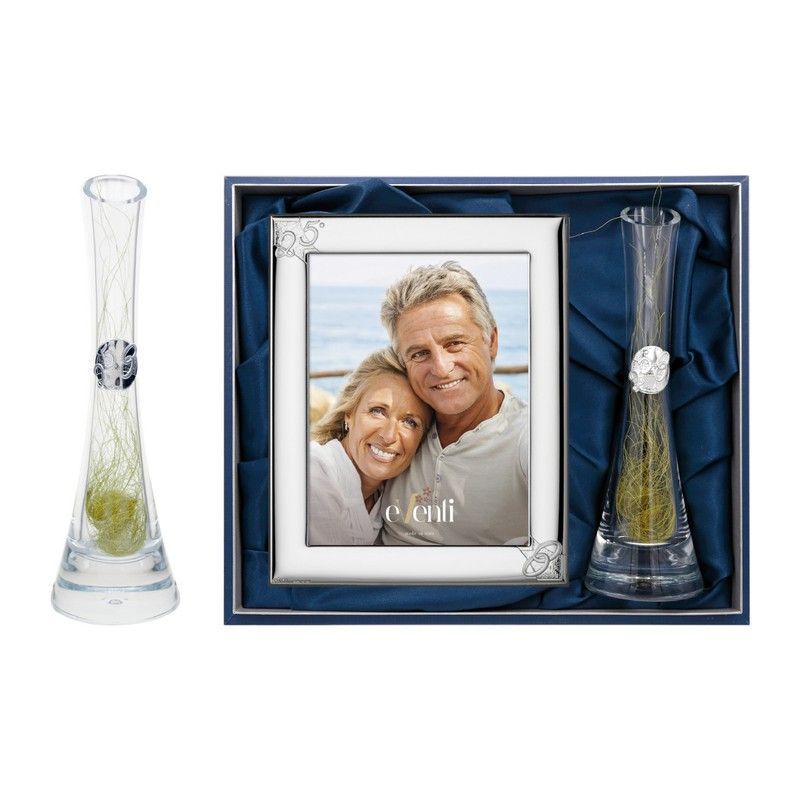 Set Portafotos Violetero Aniversario 13x18cm GA9100/13V Alianzas 25 Años: un regalo elegante y conmemorativo para celebrar 25 años de amor. Incluye un marco fotográfico blanco con detalles plateados y dos jarrones de vidrio con diseño de hoja verde, todo presentado en una caja con forro de terciopelo azul. Ideal para parejas adultas que desean pres