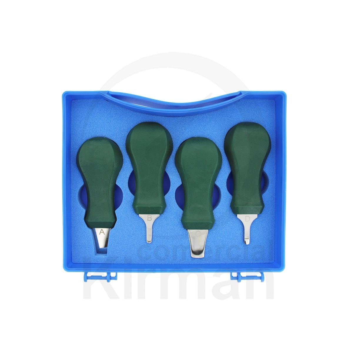 Set de 4 herramientas para abrir fondos de relojes a presión, con mangos verdes y puntas de acero inoxidable. Ideal para relojeros y aficionados a la reparación de relojes. Incluye caja de plástico azul para almacenamiento seguro y organizado. Perfecto para trabajos precisos y mantenimiento de relojes mecánicos y de cuarzo.