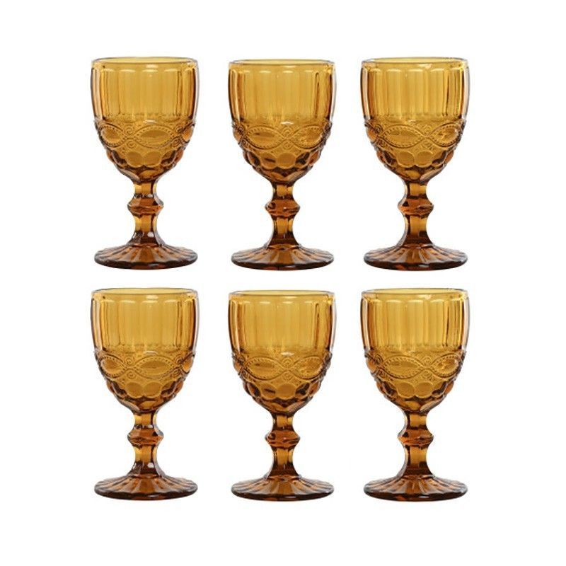 Set de 6 copas de vino de cristal en tono ámbar, colección Classic Garbo. Diseño elegante con detalles tallados en el cuerpo y base escalonada. Perfectas para servir vino o cócteles con estilo clásico. Ideal para decorar tu mesa en ocasiones especiales o uso diario. Calidad duradera y acabado sofisticado.